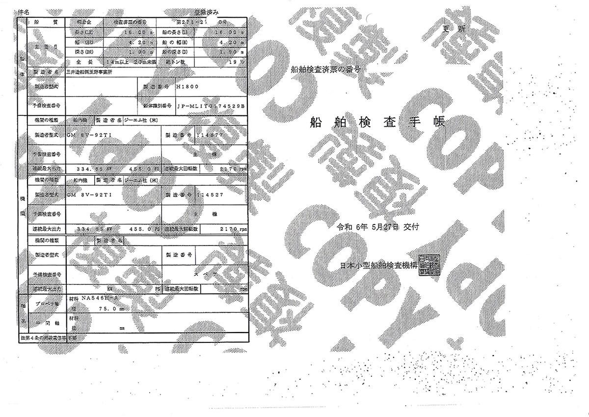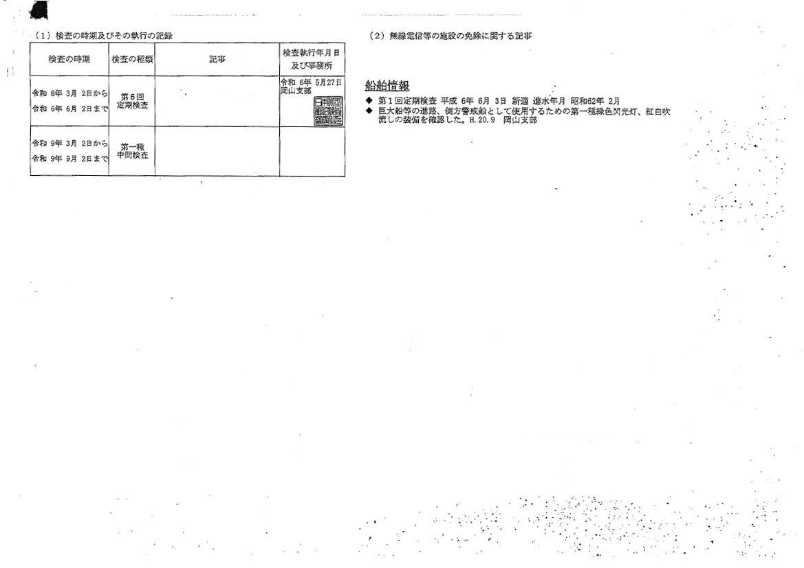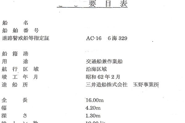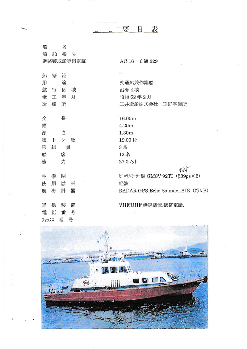 交通船兼作業船 ※画像クリックで拡大 用途 交通船兼作業船 販売価格 ¥580万円(消費税別途) ─ 入用船 ─ 曳船 1200PS位い 2機2軸希望 台船 長さ30M 小型作業船 4.9トン型 300PS位い希望 ボックスバージ 300m3積み希望 ※適船がありましたらご連絡いただければ幸いです。 ※当サイト内画像の無断引用・無断転載は、一切禁止します。 当サイト内画像の著作権は、著作権法によって権利が守られています。それらのコンテンツを当社の許諾無く無断で使用・複製・改変・公開及び領布することを一切禁止します。